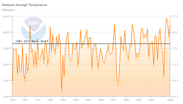 - Figure 2. Delaware statewide mean February temperature (oF) 1895-2020. Black line indicates 1981-2010 normal.