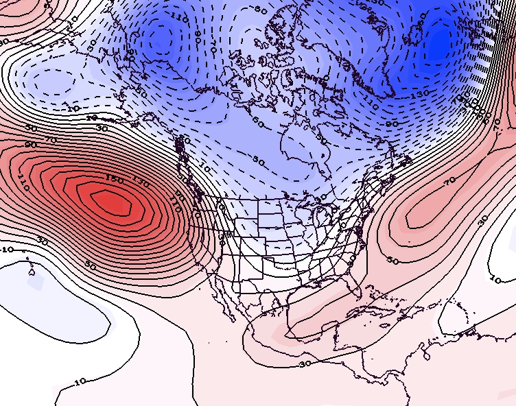 - Figure 7. 500 hPa geopotential height anomalies for February 2020. Negative (blue) anomalies indicate the presence of an anomalous jet stream trough while positive (red) height anomalies indicate the presence of an anomalous jet stream ridge.