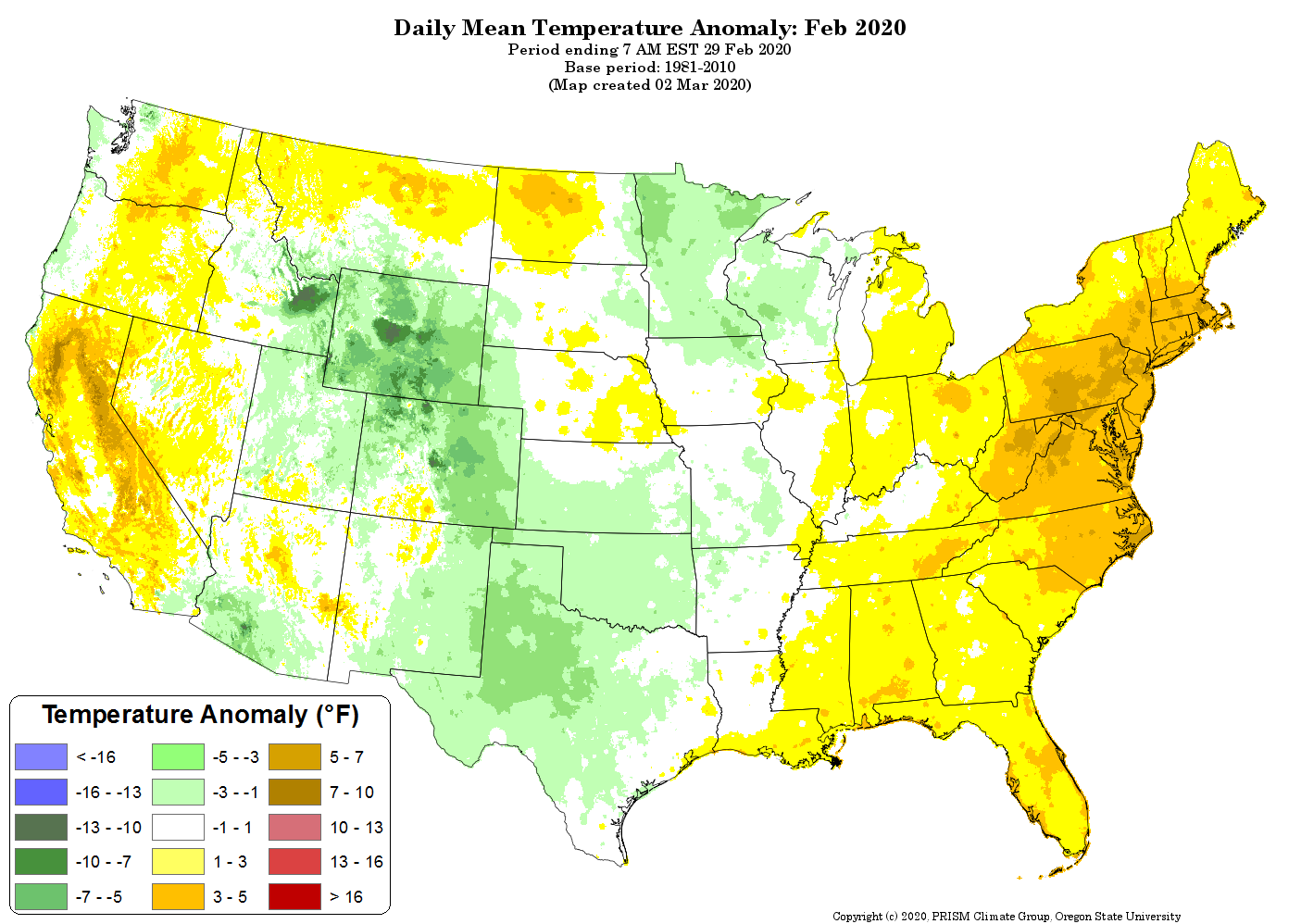 - Figure 5. National daily mean temperature anomalies for February 2020 (from the PRISM Climate Group, OSU).