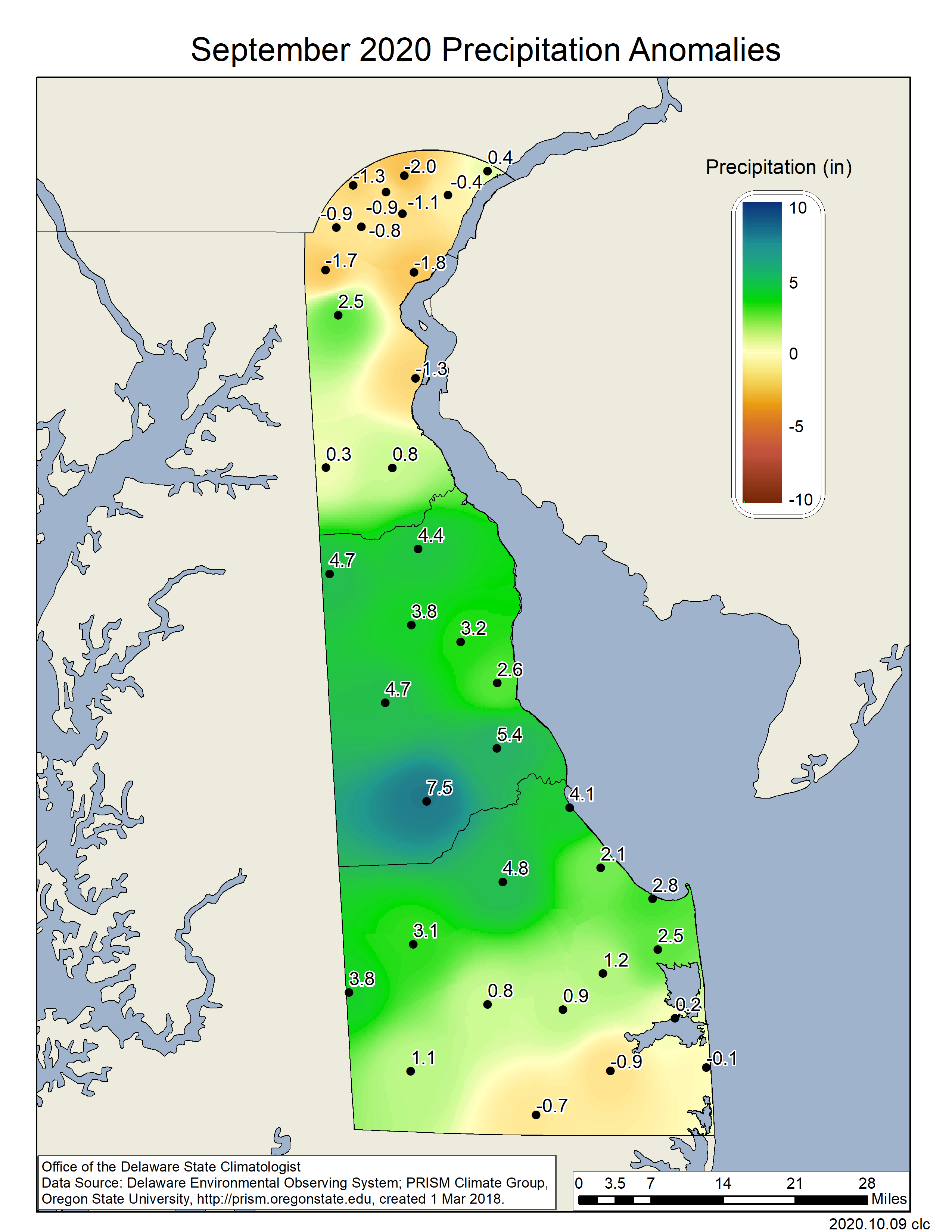 Delaware’s statewide precipitation for September 2020 averaged 3.99 inches, 0.02 inches above the 1981-2010 mean (Figure 2), placing this month in the “normal” category for all months since 1895.