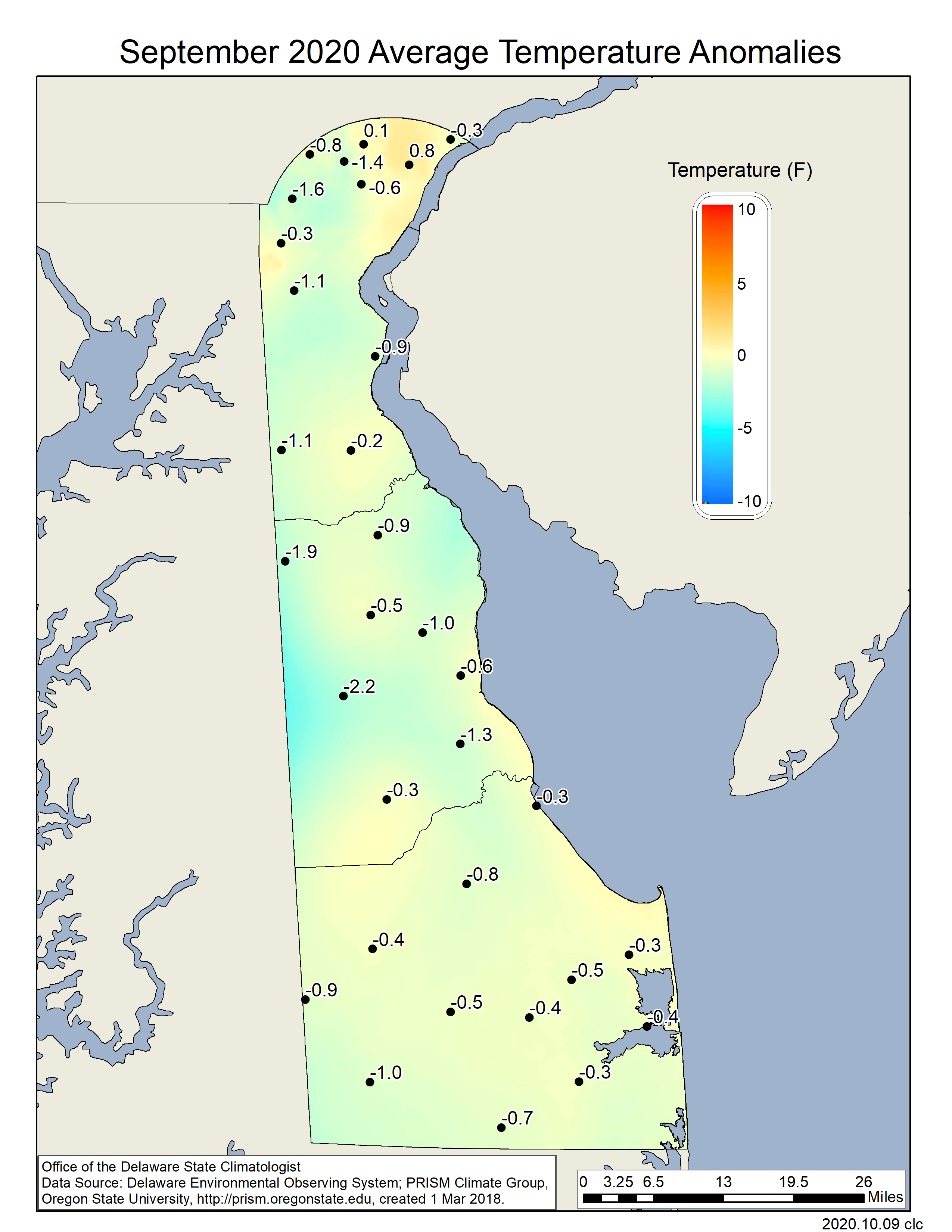 - Figure 3. September 2020 average temperature departures (oF) from the 1981-2010 mean based upon DEOS station data.