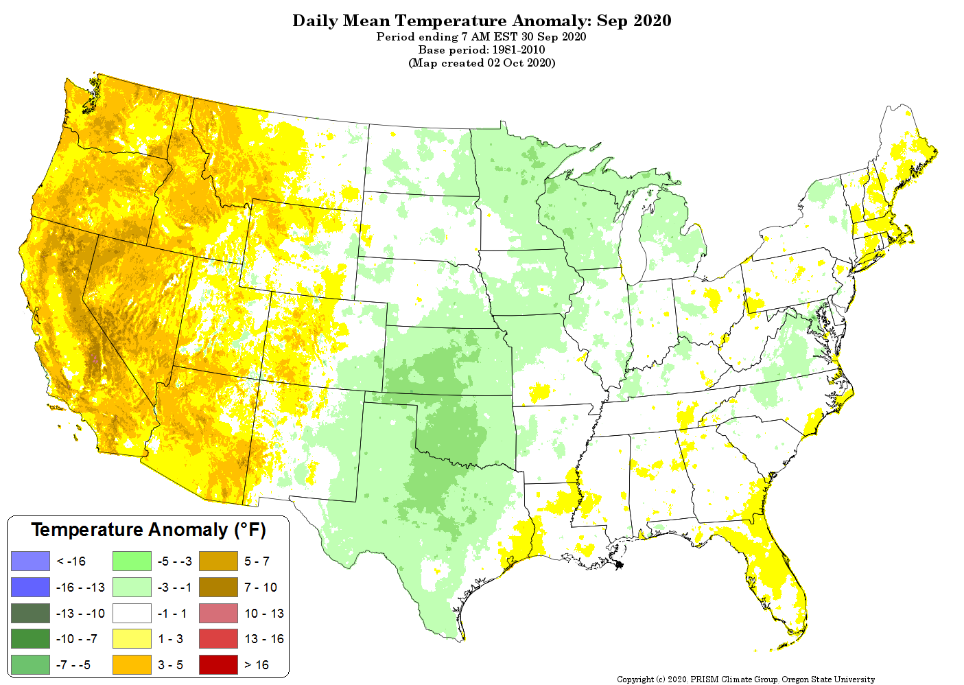 - Figure 5. National daily mean temperature anomalies for September 2020 (from the PRISM Climate Group, OSU).