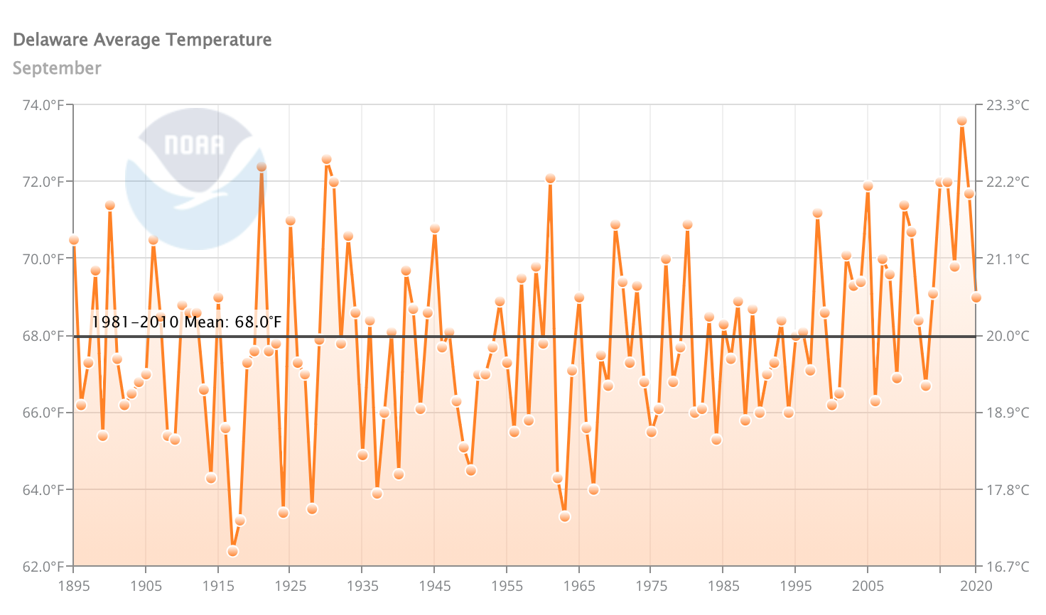 - Figure 1. Delaware statewide mean September temperature (oF) 1895-2020. Black line indicates 1981-2010 normal (NOAA, NCEI, Climate at a Glance: Statewide Time Series).