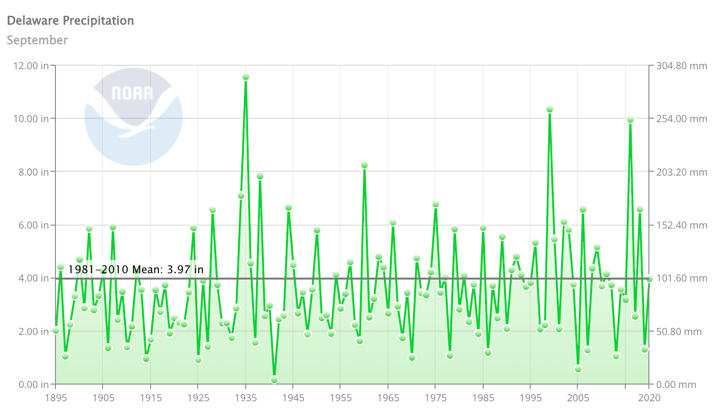 - Figure 2. Delaware statewide September precipitation (inches) 1895-2020. Black line indicates 1981-2010 normal (NOAA, NCEI, Climate at a Glance: Statewide Time Series).