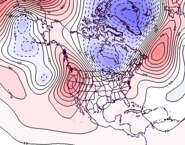 - Figure 7. 500 hPa geopotential height anomalies for September 2020. Negative (blue) anomalies indicate the presence of an anomalous jet stream trough while positive (red) height anomalies indicate the presence of an anomalous jet stream ridge.