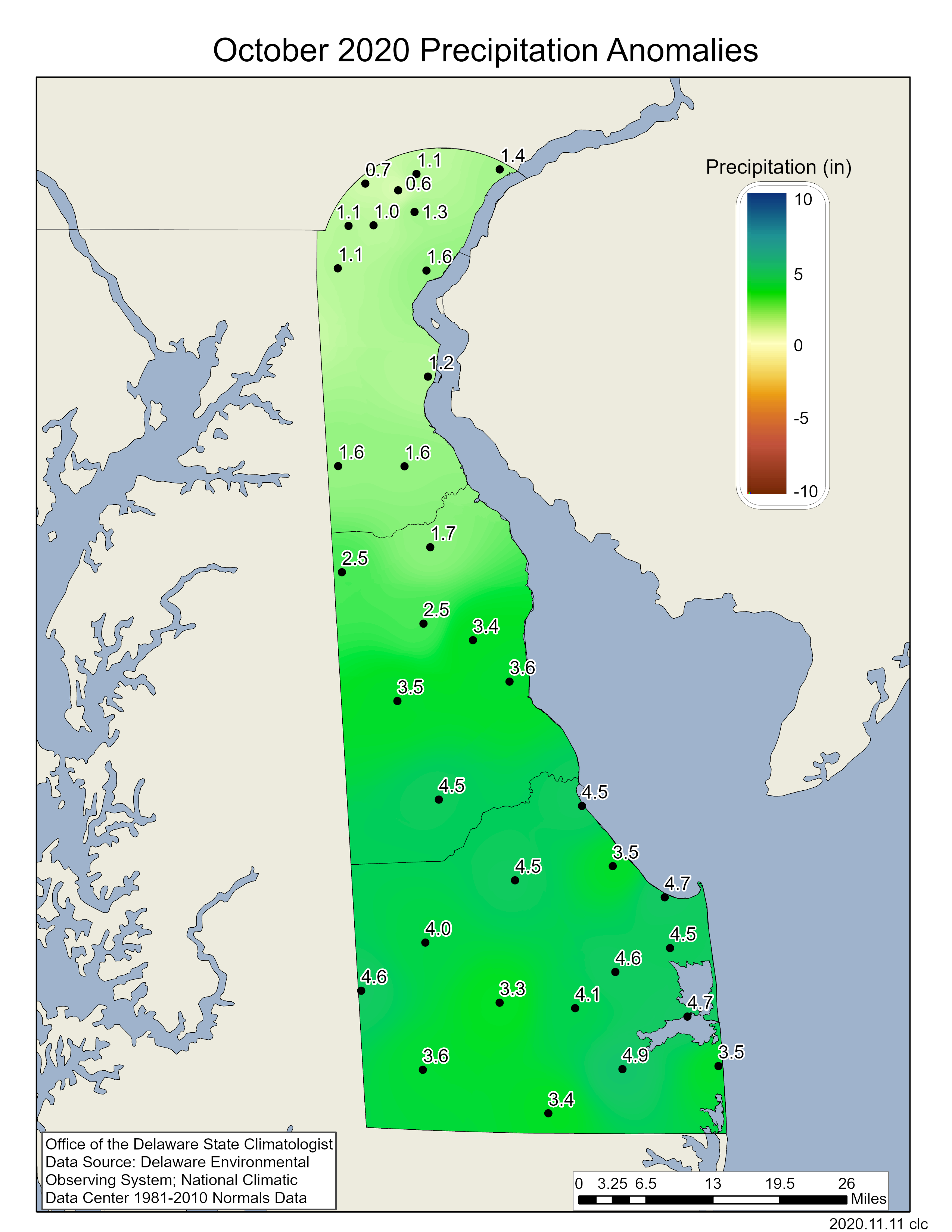 Delaware’s statewide precipitation for October 2020 averaged 5.16 inches, 1.70 inches above the 1981-2010 mean (Figure 2), placing this month’s precipitation total in the top one-third of all months since 1895.