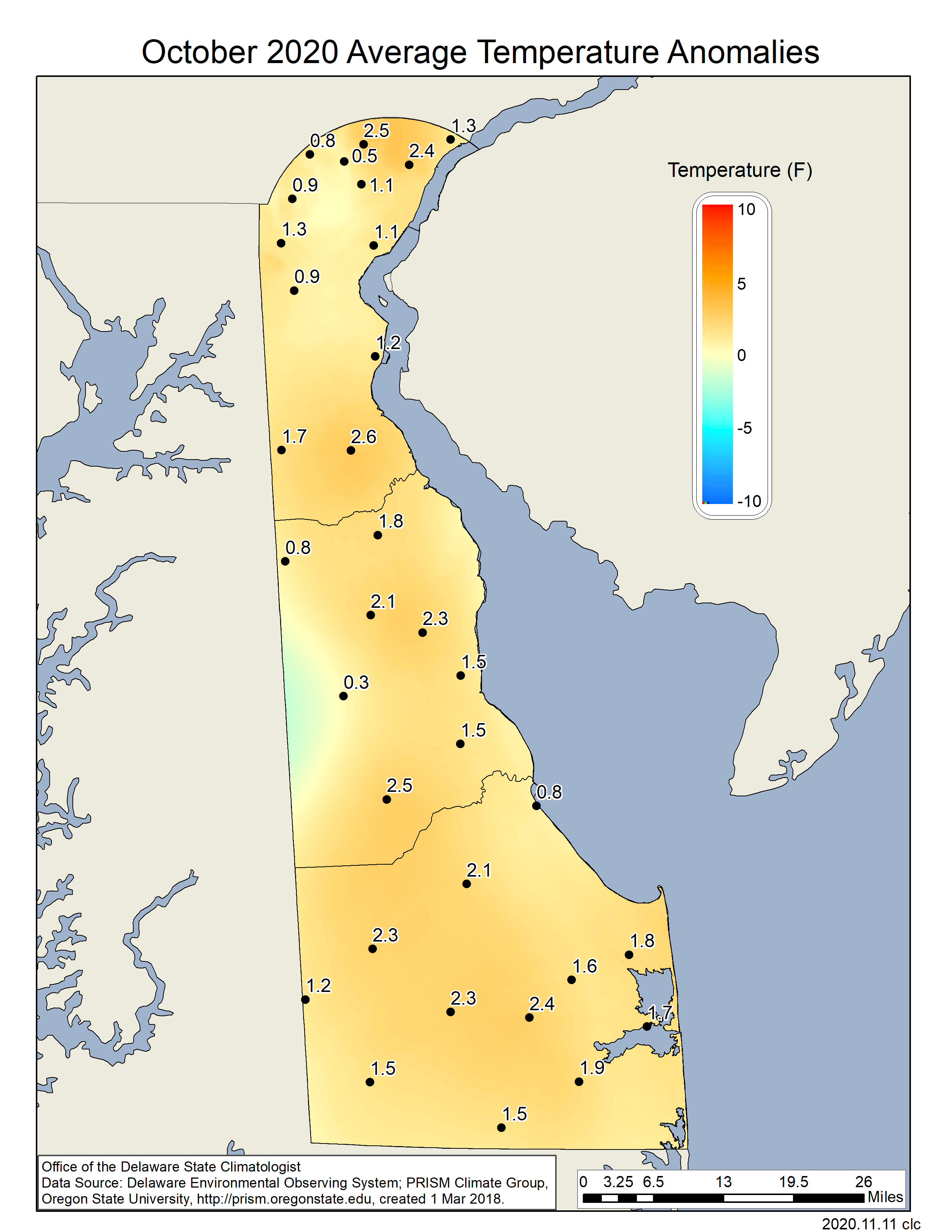 - Figure 3. October 2020 average temperature departures (oF) from the 1981-2010 mean based upon DEOS station data.