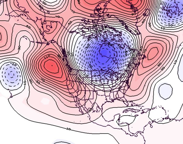 - Figure 7. 500 hPa geopotential height anomalies for October 2020. Negative (blue) anomalies indicate the presence of an anomalous jet stream trough while positive (red) height anomalies indicate the presence of an anomalous jet stream ridge.