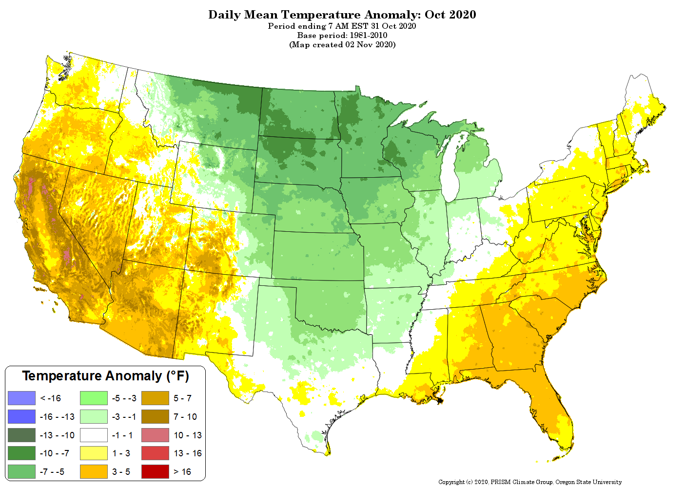 - Figure 5. National daily mean temperature anomalies for October 2020 (from the PRISM Climate Group, OSU).