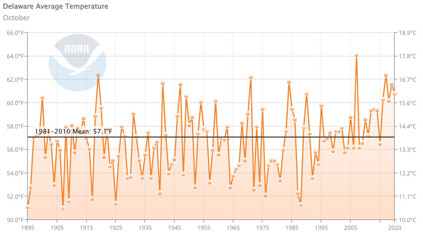 - Figure 1. Delaware statewide mean October temperature (oF) 1895-2020. Black line indicates 1981-2010 normal (NOAA, NCEI, Climate at a Glance: Statewide Time Series).