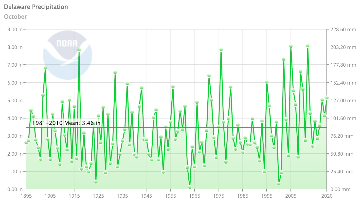 - Figure 2. Delaware statewide October precipitation (inches) 1895-2020. Black line indicates 1981-2010 normal (NOAA, NCEI, Climate at a Glance: Statewide Time Series).