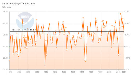 - Figure 1. Delaware statewide mean February temperature (°F) 1895-2021. Black line indicates 1981-2010 normal (NOAA, NCEI, Climate at a Glance: Statewide Time Series).