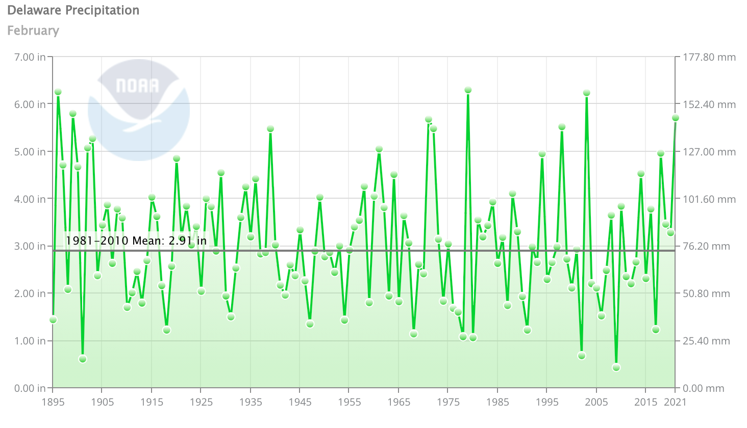 - Figure 2. Delaware statewide February precipitation (inches) 1895-2021. Black line indicates 1981-2010 normal (NOAA, NCEI, Climate at a Glance: Statewide Time Series).
