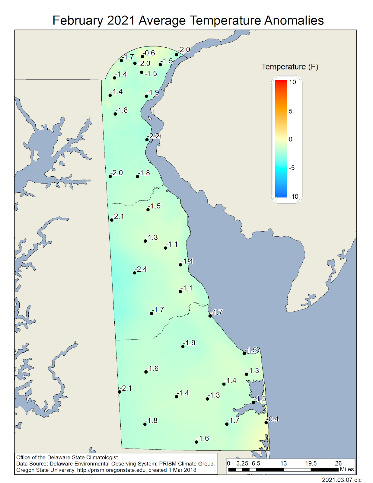 - Figure 3. February 2021 average temperature departures (°F) from the 1981-2010 mean based upon DEOS station data.
