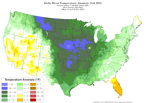 - Figure 4. National daily mean temperature anomalies for February 2021 (from the PRISM Climate Group, OSU).
