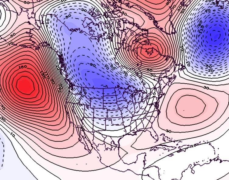 - Figure 6. 500 hPa geopotential height anomalies for February 2021. Negative (blue) anomalies indicate the presence of an anomalous jet stream trough while positive (red) height anomalies indicate the presence of an anomalous jet stream ridge.