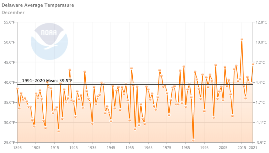 - Figure 1. Delaware statewide mean December temperature (°F) 1895-2021. Black line indicates 1991-2020 normal (NOAA, NCEI, Climate immediately: Statewide Time Series).