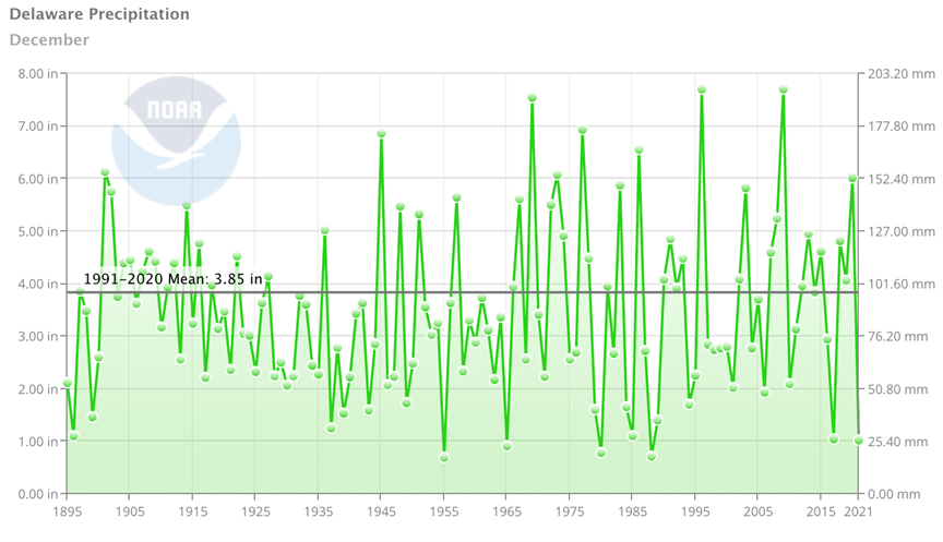 - Figure 2. Delaware statewide December precipitation (inches) 1895-2021. Black line indicates 1991-2020 normal (NOAA, NCEI, Climate at a Glance: Statewide Time Series).