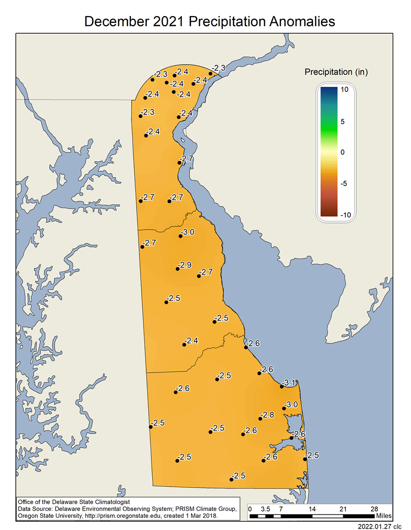 Delaware’s statewide precipitation for December 2021 averaged 1.03 inches, 2.82 inches below the 1991-2020 mean (Figure 2). This placed this month’s precipitation as the 5th lowest December precipitation since records began in 1895.