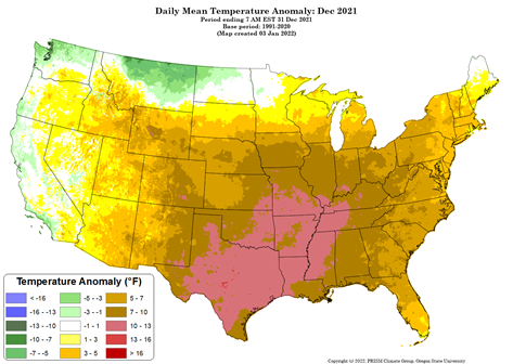 - Figure 5. National daily mean temperature anomalies for December 2021 (from the PRISM Climate Group, OSU).