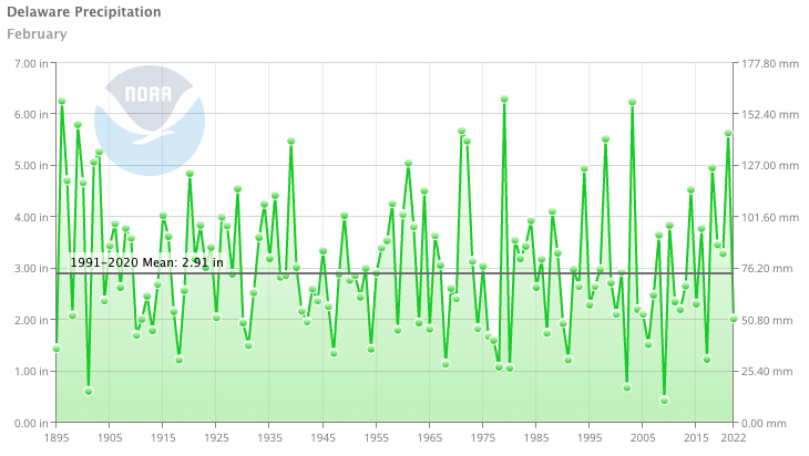 - Figure 2. Delaware statewide February precipitation (inches) 1895-2022. Black line indicates 1991-2020 normal (NOAA, NCEI, Climate at a Glance: Statewide Time Series).