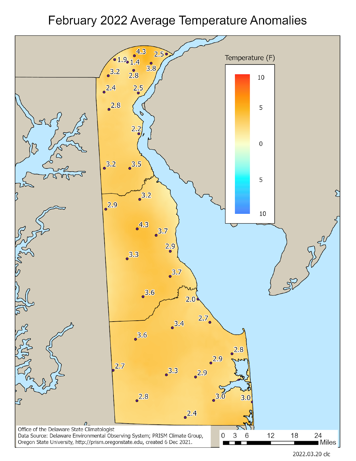 - Figure 3. February 2022 average temperature departures (°F) from the 1991-2020 mean based upon DEOS station data.