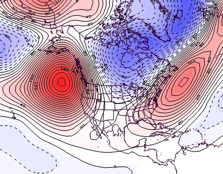 - Figure 7. 500 hPa geopotential height anomalies for February 2022. Negative (blue) anomalies indicate the presence of an anomalous jet stream trough while positive (red) height anomalies indicate the presence of an anomalous jet stream ridge.