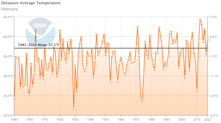 - Figure 1. Delaware statewide mean February temperature (°F) 1895-2022. Black line indicates 1991-2020 normal (NOAA, NCEI, Climate immediately: Statewide Time Series).