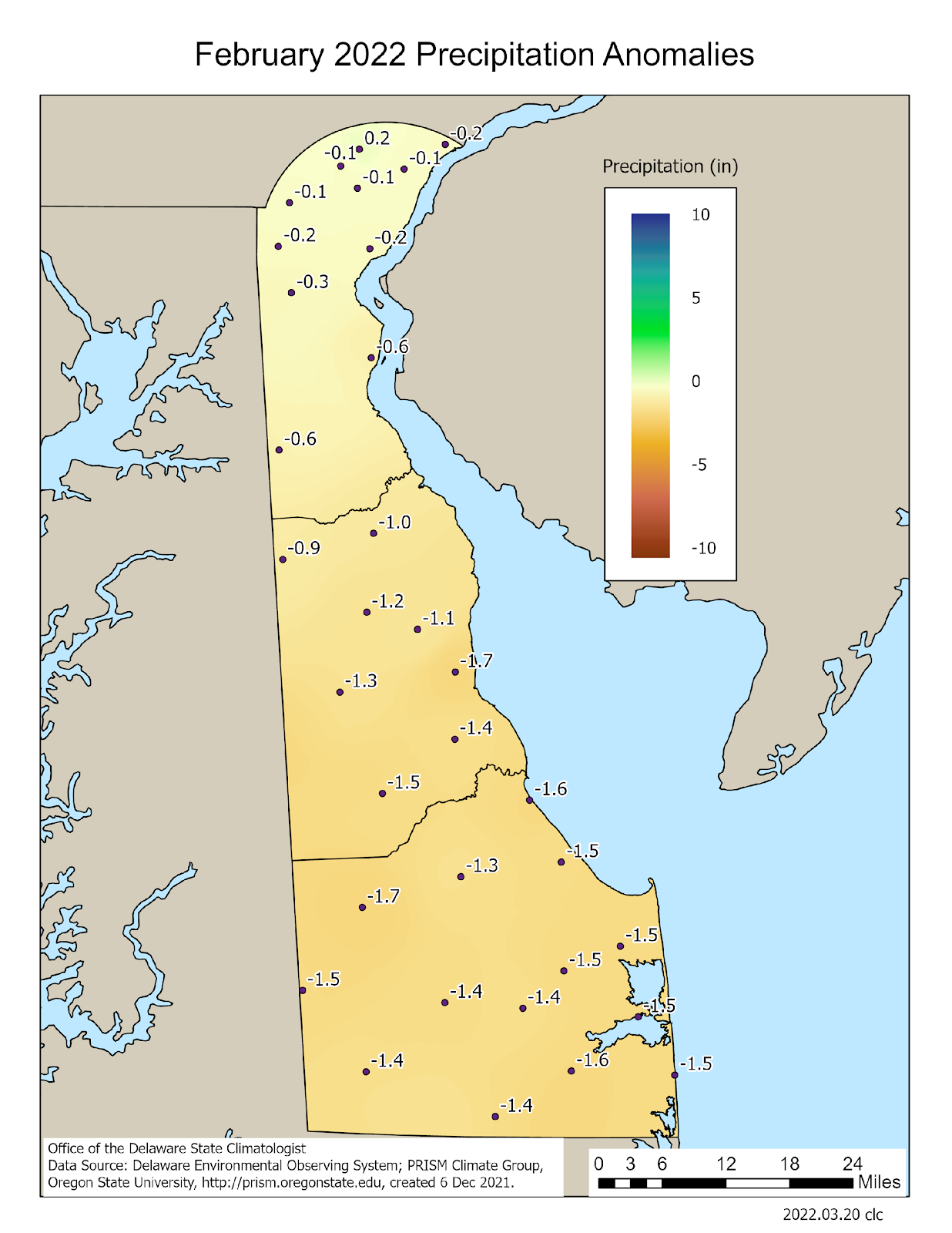 Data from the Delaware Environmental Observing System (DEOS) show that temperature departures were uniformly above normal across the entire State, with many stations seeing positive temperature anomalies of greater than 3o F (Figure 3). Precipitation was below normal across the entire state, with the largest negative departures found across Sussex County (Figure 4). A snowfall event on February 13th dropped between one and two inches of snow across northern Delaware.