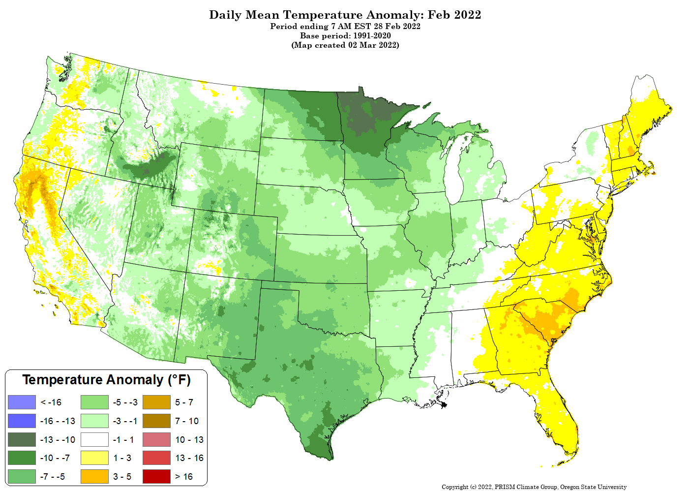 - Figure 5. National daily mean temperature anomalies for February 2022 (from the PRISM Climate Group, OSU).
