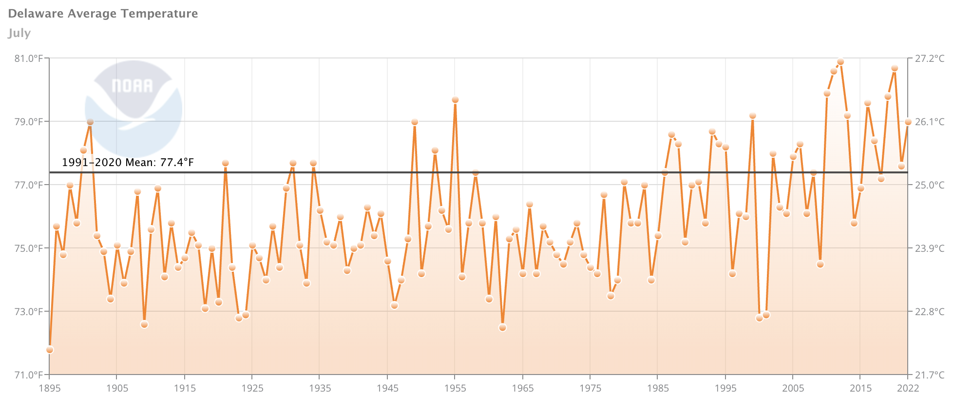 - Figure 1. Delaware statewide mean July temperature (°F) 1895-2022. Black line indicates 1991-2020 normal (NOAA, NCEI, Climate at a Glance: Statewide Time Series).