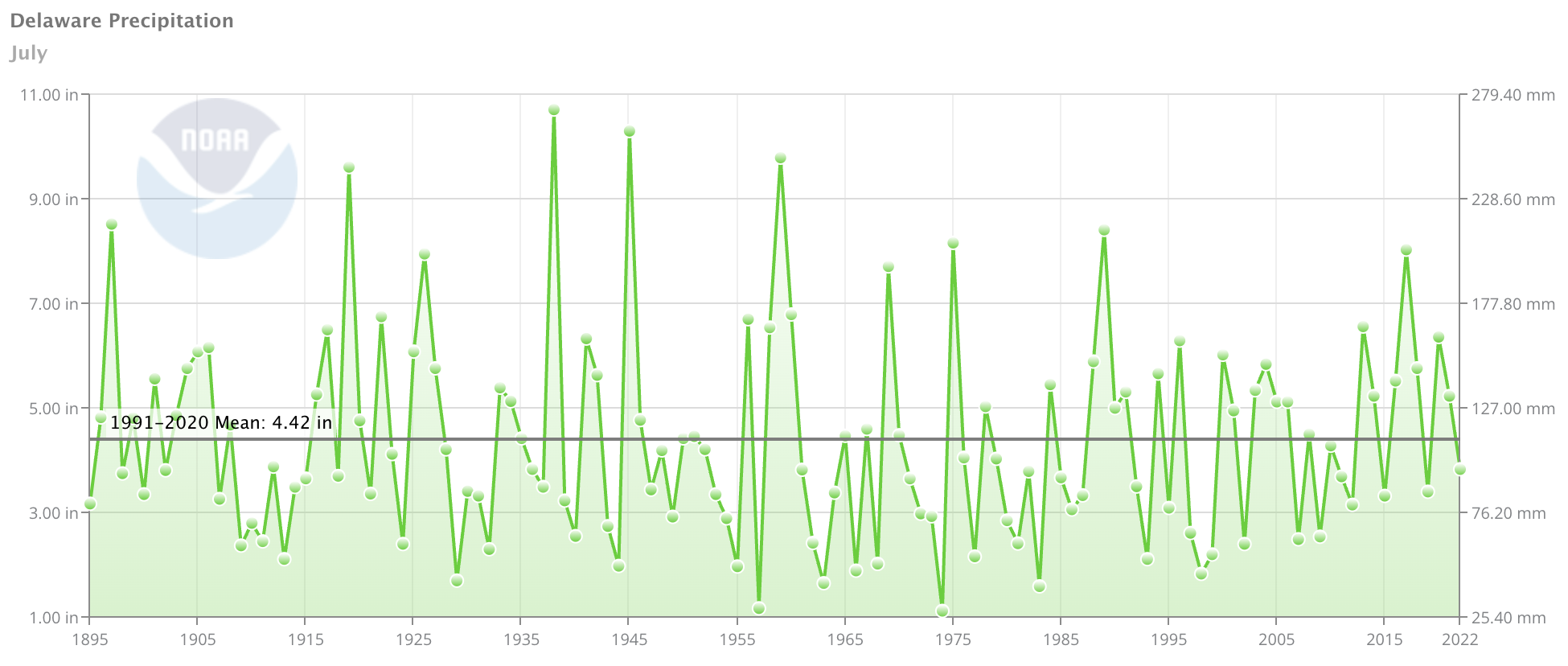 - Figure 2. Delaware statewide July precipitation (inches) 1895-2022. Black line indicates 1991-2020 normal (NOAA, NCEI, Climate at a Glance: Statewide Time Series).