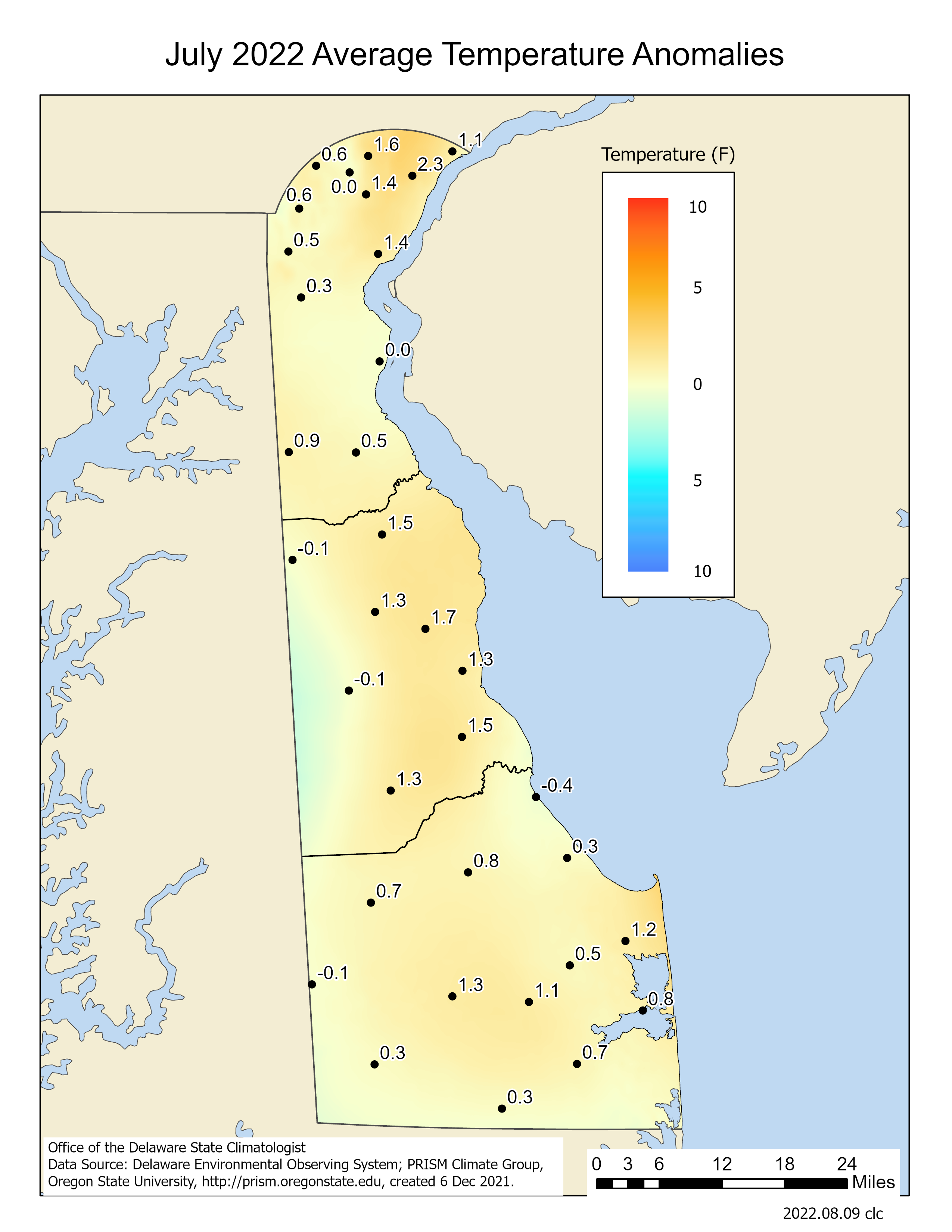 - Figure 3. July 2022 average temperature departures (°F) from the 1991-2020 mean based upon DEOS station data.