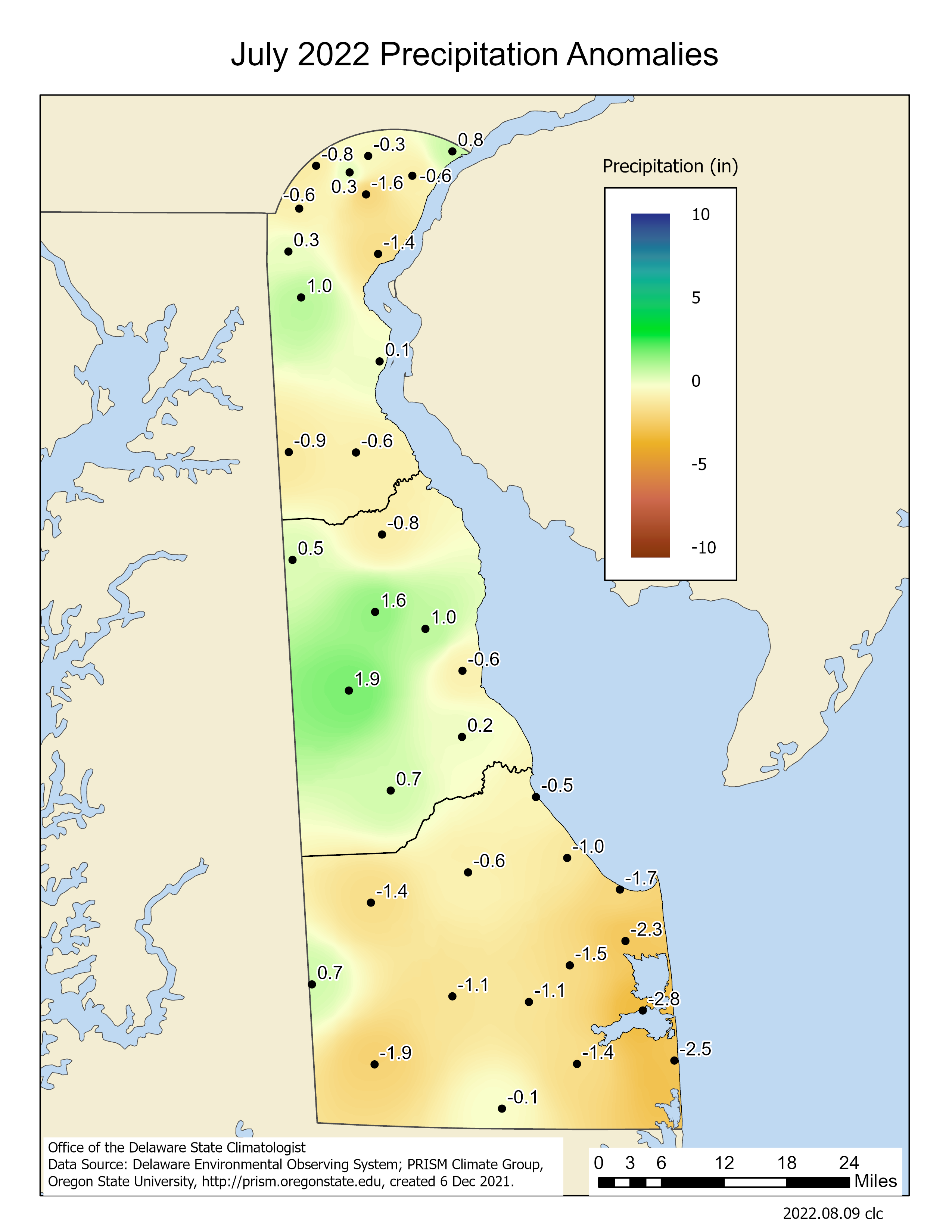 Data from the Delaware Environmental Observing System (DEOS) show that temperature departures were above normal across the majority of the state (Figure 3). Precipitation observations varied across the state due to the nature of the summer’s convective (thunderstorm) activity, with the largest negative precipitation anomalies occurring in coastal Sussex County (Figure 4).