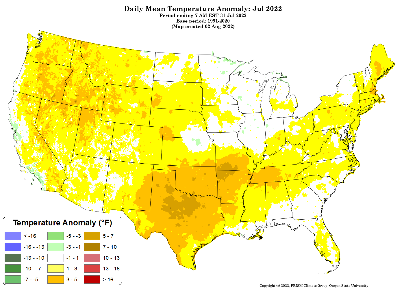 - Figure 5. National daily mean temperature anomalies for July 2022 (from the PRISM Climate Group, OSU).