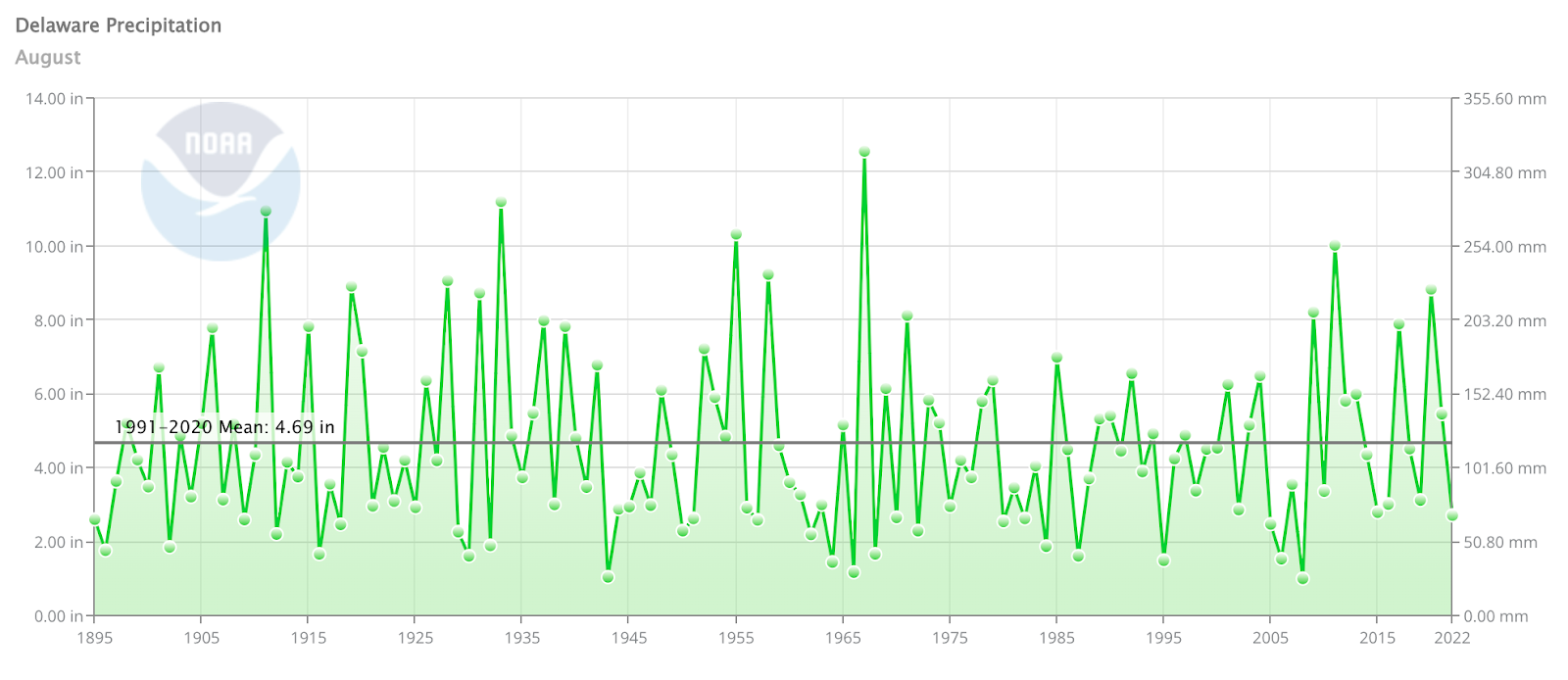 - Figure 2. Delaware statewide August precipitation (inches) 1895-2022. Black line indicates 1991-2020 normal (NOAA, NCEI, Climate at a Glance: Statewide Time Series).