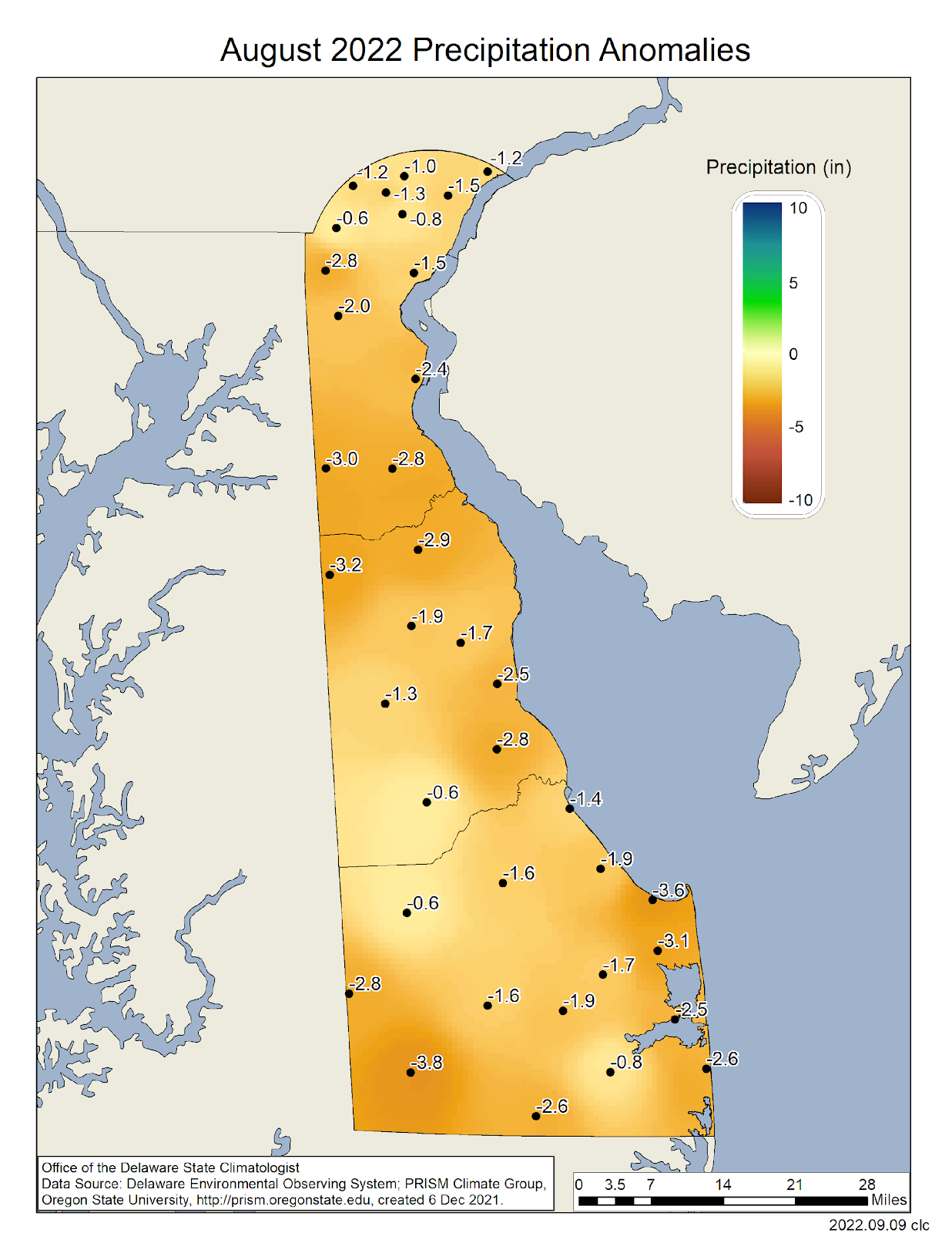 Data from the Delaware Environmental Observing System (DEOS) show that temperature departures were above normal across the entire state (Figure 3), with many stations more than 2° F above normal. Precipitation observations were uniformly below normal across the State, with many negative precipitation anomalies topping three inches (Figure 4).