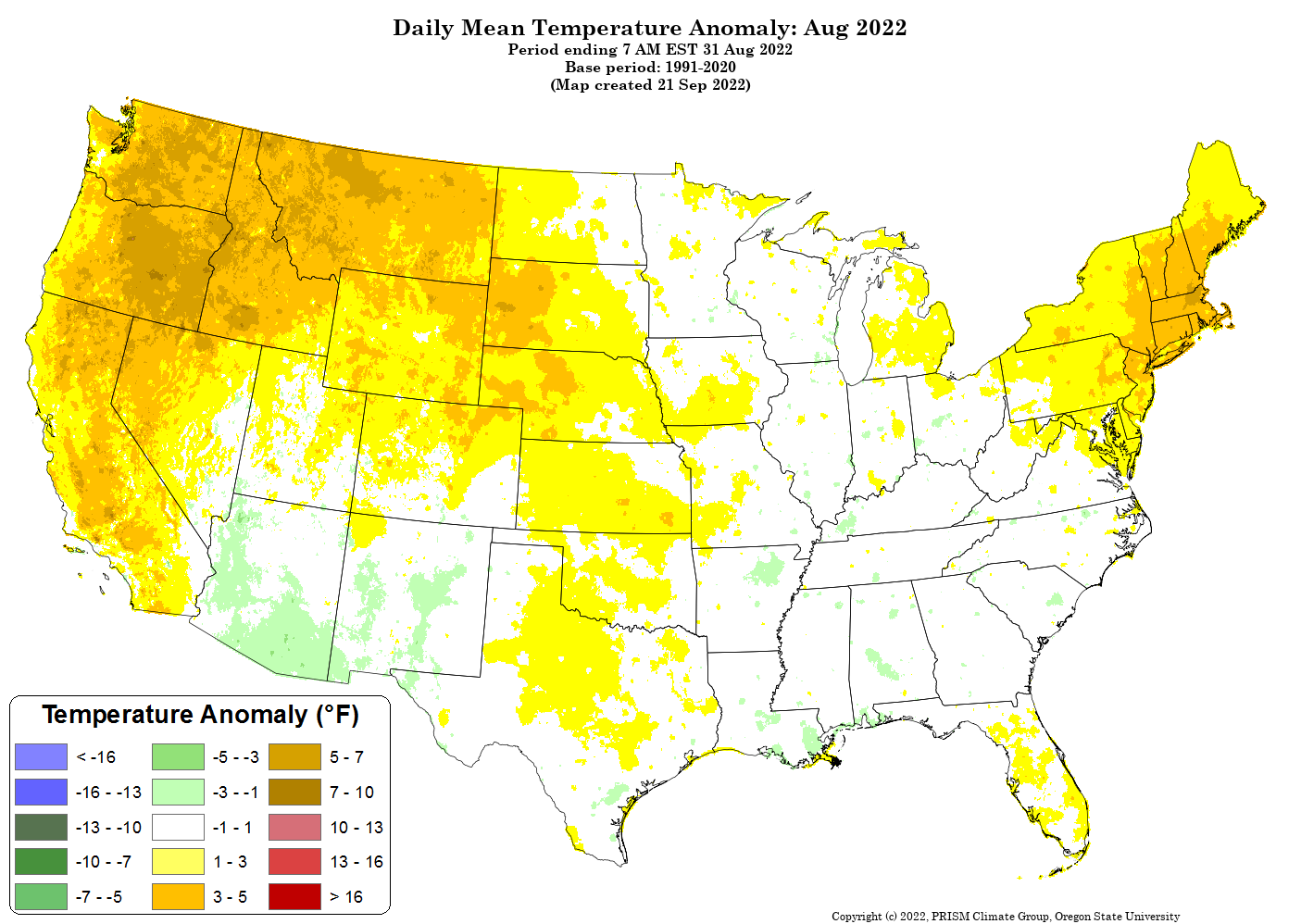 - Figure 5. National daily mean temperature anomalies for August 2022 (from the PRISM Climate Group, OSU).
