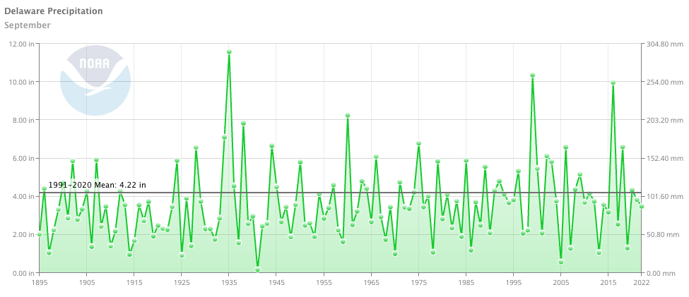- Figure 2. Delaware statewide September precipitation (inches) 1895-2022. Black line indicates 1991-2020 normal (NOAA, NCEI, Climate at a Glance: Statewide Time Series).