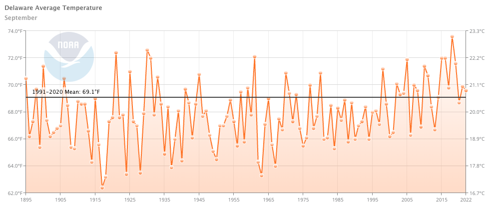 - Figure 1. Delaware statewide mean September temperature (°F) 1895-2022. Black line indicates 1991-2020 normal (NOAA, NCEI, Climate at a Glance: Statewide Time Series).