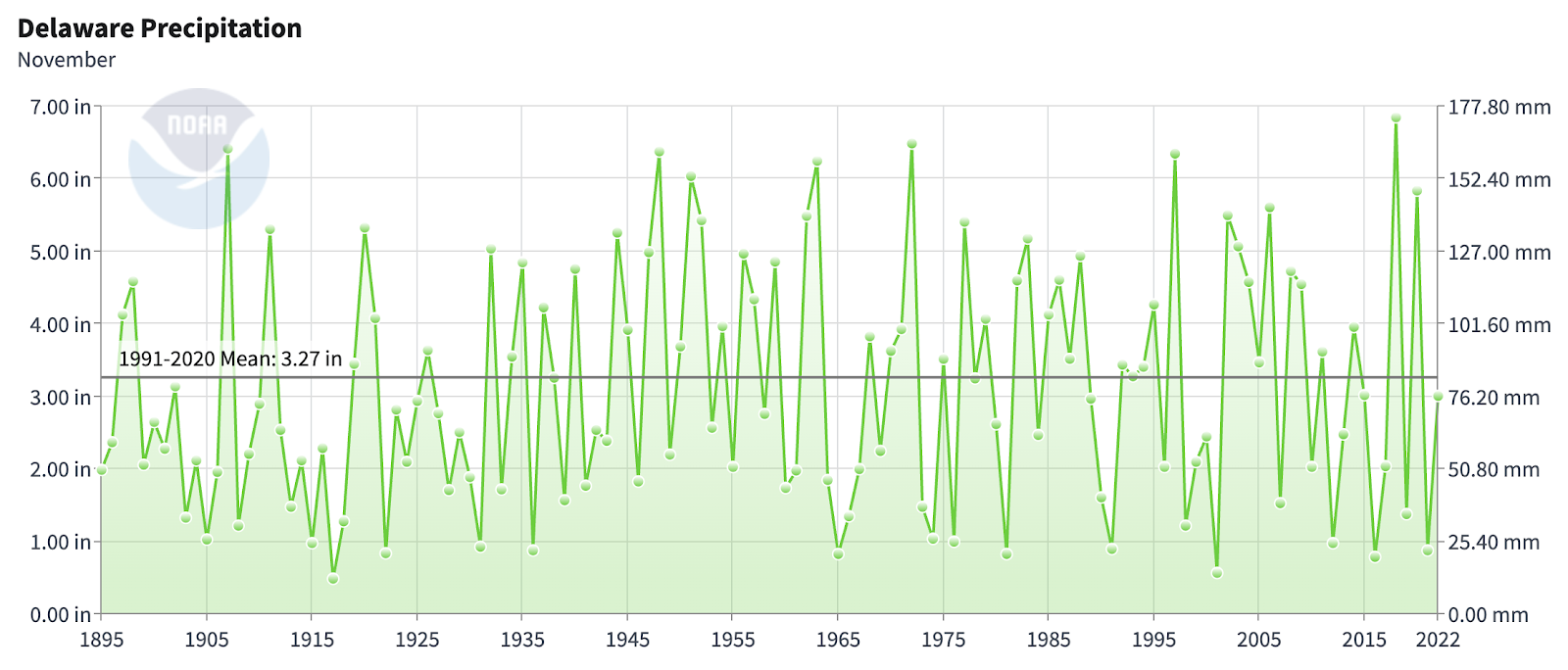 - Figure 2. Delaware statewide November precipitation (inches) 1895-2022. Black line indicates 1991-2020 normal (NOAA, NCEI, Climate at a Glance: Statewide Time Series).