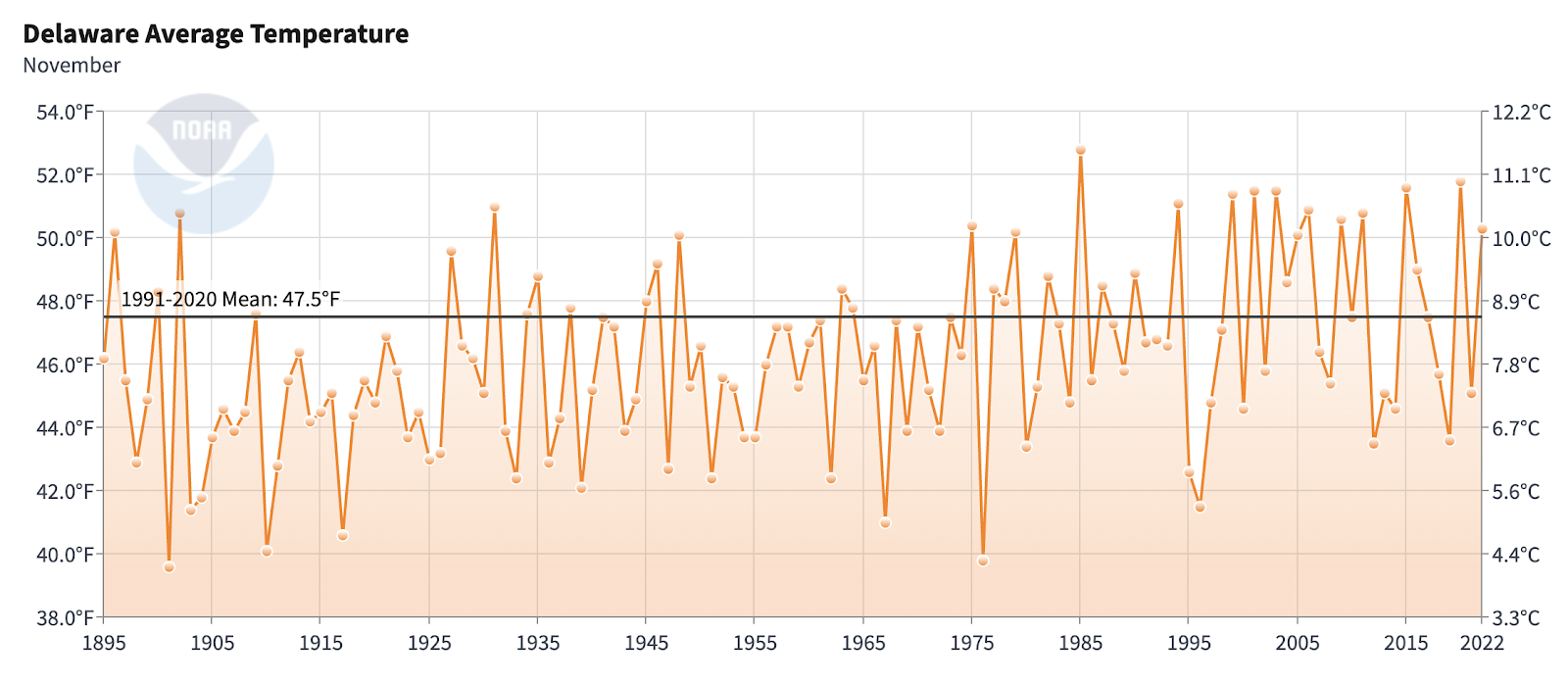 - Figure 1. Delaware statewide mean November temperature (°F) 1895-2022. Black line indicates 1991-2020 normal (NOAA, NCEI, Climate at a Glance: Statewide Time Series).
