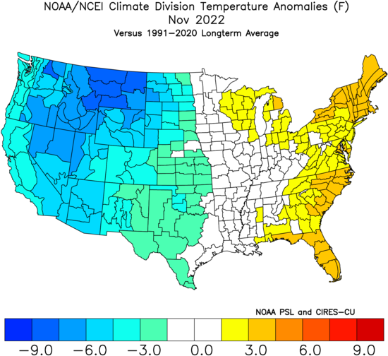 - Figure 5. NOAA/NCEI climate division temperature anomalies (°F) for November 2022 (from NOAA Physical Sciences Laboratory).