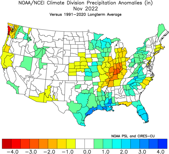 - Figure 6. NOAA/NCEI climate division precipitation anomalies (inches) for November 2022 (from NOAA Physical Sciences Laboratory).