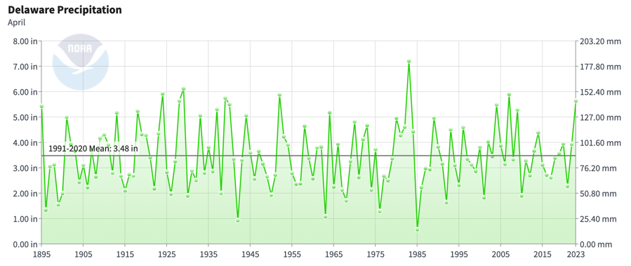 - Figure 2. Delaware statewide April precipitation (inches) 1895-2023. Black line indicates 1991-2020 normal (NOAA, NCEI, Climate at a Glance: Statewide Time Series).