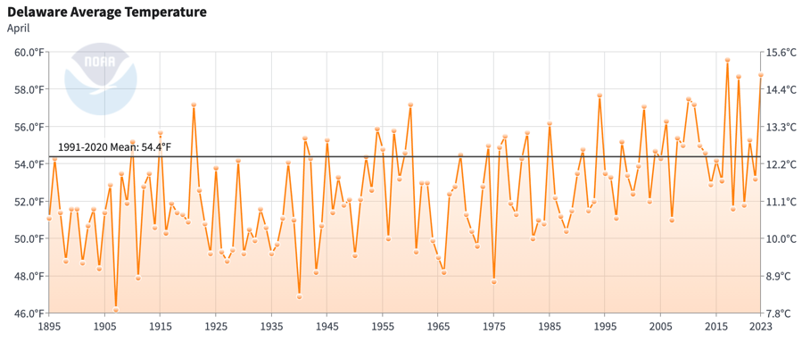 - Figure 1. Delaware statewide mean April temperature (oF) 1895-2023. Black line indicates 1991-2020 normal (NOAA, NCEI, Climate at a Glance: Statewide Time Series).