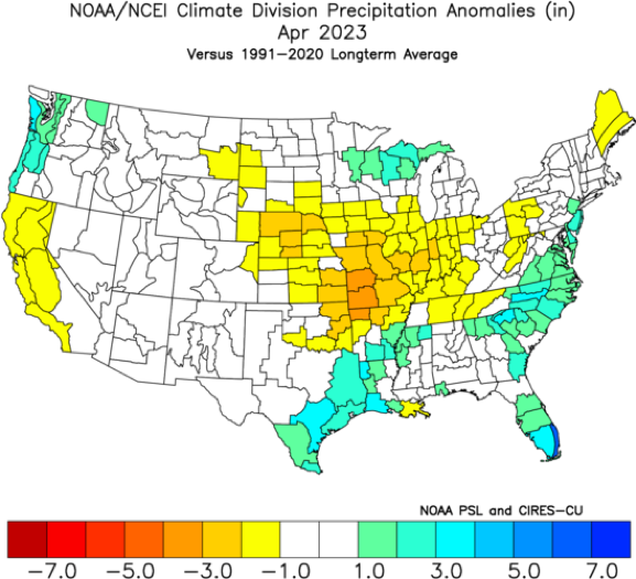 - Figure 6. NOAA/NCEI climate division precipitation anomalies (inches) for April 2023 (from NOAA Physical Sciences Laboratory).