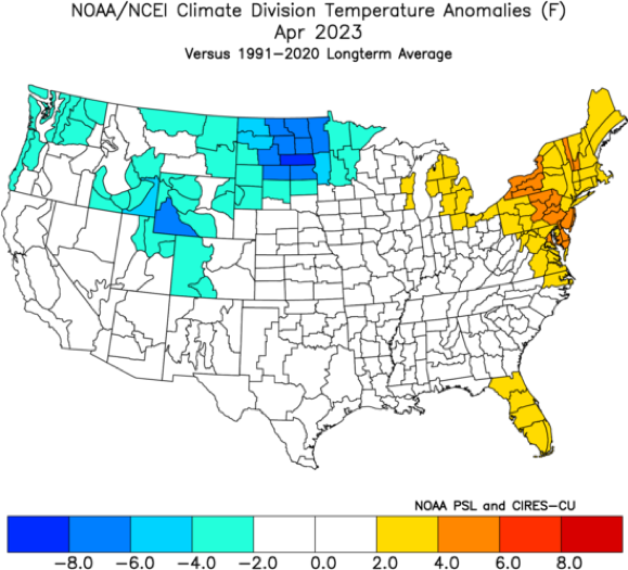 - Figure 5. NOAA/NCEI climate division temperature anomalies (degees F) for April 2023 (from NOAA Physical Sciences Laboratory).