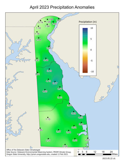 Delaware’s statewide precipitation for April 2023 averaged 5.65 inches, 2.17 inches above the 1991-2020 mean of 3.48 inches (Figure 2). This month’s precipitation was tied with 1928 as the 7th wettest since 1895. Interestingly, most of the April precipitation fell during the final three days of the month.