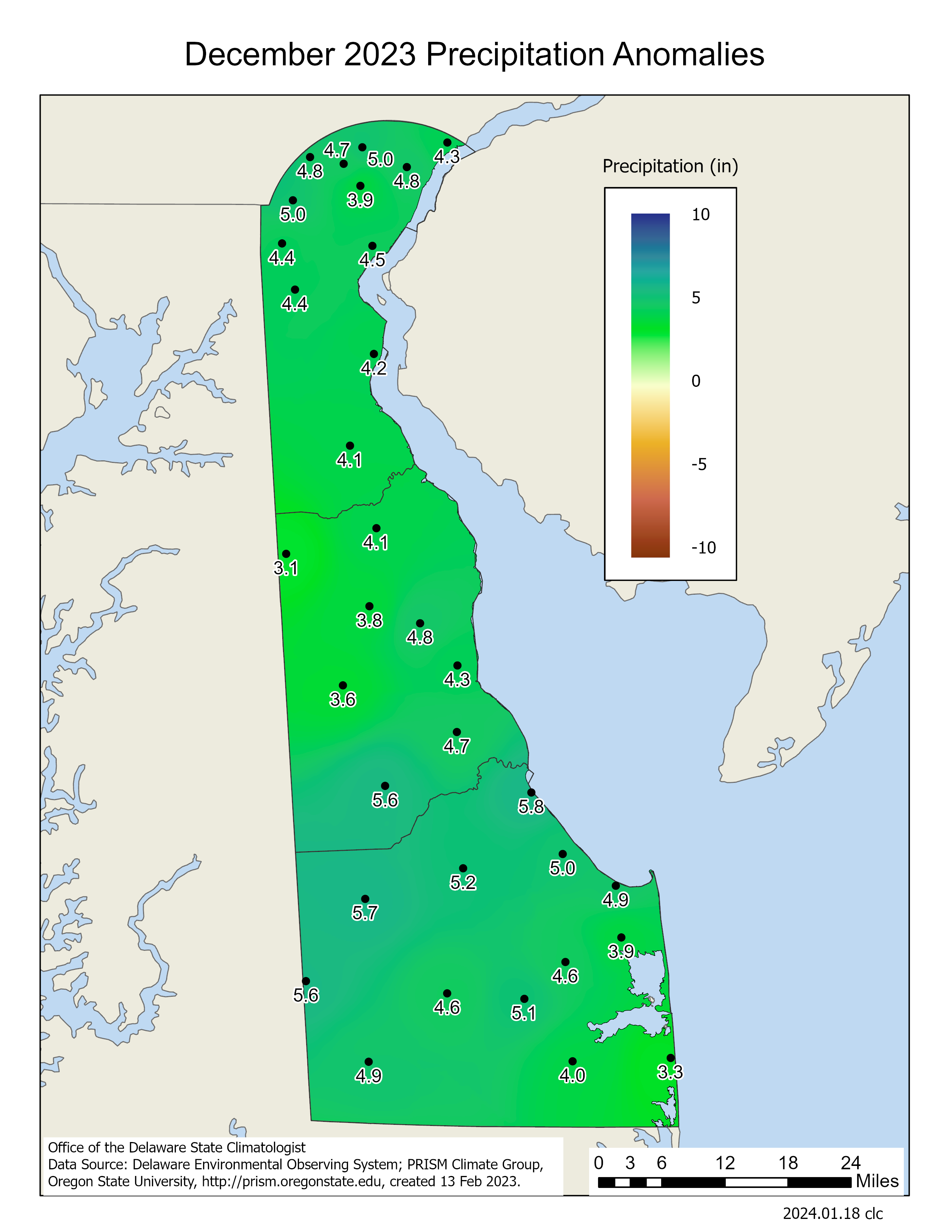 Delaware’s statewide precipitation for December 2023 averaged 8.23 inches, 4.38 inches above the 1991-2020 mean of 3.85 inches (Figure 2). This month’s precipitation was the highest December value since 1895.